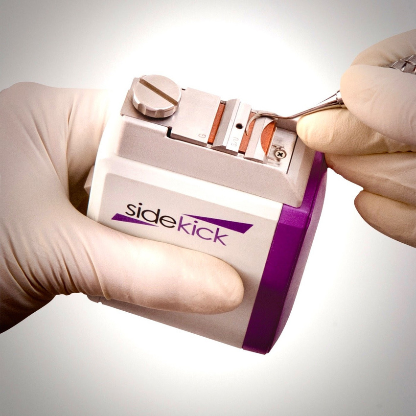 電動シャープナー サイドキック 【サイドキック(Sidekick™)とは…】 ●手のひらサイズでコンパクト・軽量デザイン! チェアサイドでのシャープニングに対応 ●第一シャンクをガイドに沿わせるだけの簡単操作 ●短時間でシャープニング完了、メンテナンス効率をアップ ●AC電源不要のコードレス仕様(単三電池2個で動きます) ●オートクレーブ滅菌が可能な、シャープニングストーンやガイドプレート 中部日本デンタルショー開催期間中、ヒューフレディブース(B-8)にて、サイドキックをご体感いただけます!