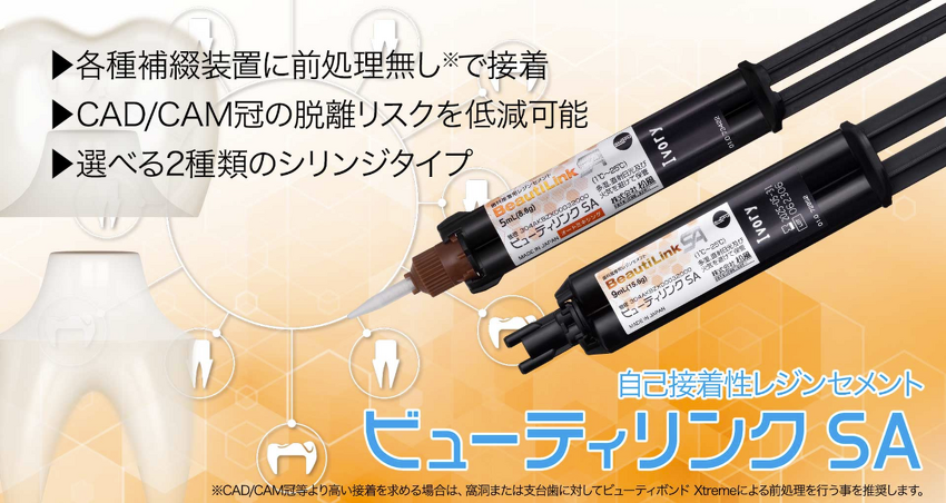 自己接着性レジンセメント「ビューティリンク SA」は保険診療から自費診療まであらゆる補綴装置の接着に活躍いたします。本品は新規化学重合開始剤を導入し、松風独自の酸性モノマーの配合量を増加させたことで、口腔内セット後から高い接着力を発現することを可能にしました。さらにCR充填でも活躍する1液性ボンディング材「ビューティボンドXtreme」を歯質・支台歯に塗布することでさらに接着力が向上します。 また、ビューティリンクSAは松風独自に開発したS-PRGフィラーが含まれており、フィラーの効果によって6種類のイオン(マルチイオン)をリリース&リチャージすることが最大の特長です。その機能は大きく分けて歯質強化・抗プラーク付着性・酸中和能の3つがあり、歯質(支台歯)およびセメントマージン周辺部に対して耐酸性の向上および抗プラーク付着性により周辺環境の健全化が期待できます。