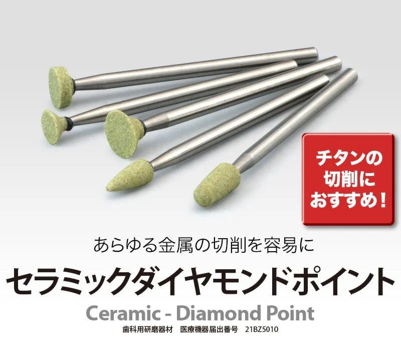 チタンの切削におすすめします!カーボランダムの感覚で使用できます。ダイヤモンドを高密度に配合し、ポーセレンやジルコニア、あらゆる金属の切削を容易にします。耐研磨性に優れ、長時間使用しても切れ味を保ちます。